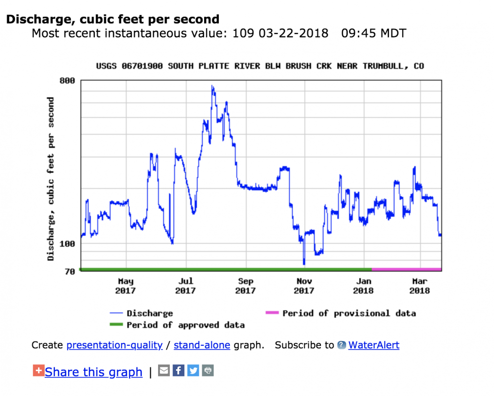 As of todays date, the south platte in Deckers is at 110cfs. Historically, flows are around 130cfs. That is within 30% +/- range. When looking at the historical over a year, I can see flows stay within 100 – 200cfs, so that is in the optimal fishing range. It’s spring time here so we can expect midges and baetis to be hatching on that river and active under the water. The river is in a bit of a canyon, but there is decent room for it to expand with lots of solid rocks and stable runs, holes and riffles that stay in the same places roughly year round so it’s a pretty stable river. Given all of this data put together, we can assume flows are going to produce pretty stable fishing and should produce fishing with what is to be expected for the time of year. No crazy weather or anything recently either to make us think it would be fishing out of the normal and we can expect a normal to good day on Deckers.