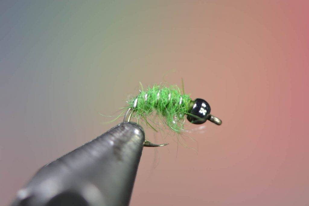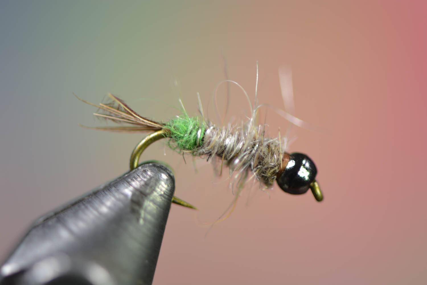 The same colors and sizes apply from the free form caddis with tan and olive being the best colors instead of brown, but if you look in your rivers, caddis will make casings from the natural forage which can change in color and texture from river to river and spot to spot. These caddis are usually a bright green and at times, especially when dislodged and floating through the river, peek out of their casing to find a place to shoot their spidey-webs and hold onto rocks (spidey-webs is not the technical term of course, it’s actually a kind of silk). That peeking aspect is a signal to eat for trout. They are pretty well camaflouged as river debris otherwise. The modification you should tie with this pattern is to add a small hot spot of black and chartreuse/bright green dubbing to one side of the fly. That hot spot is the only variation you need and I’d have a few on hand to use for sure throughout the day, you’ll find they are always on the menu for trout as caddis are always in the river and more active during warmer months and water temps above 45º.