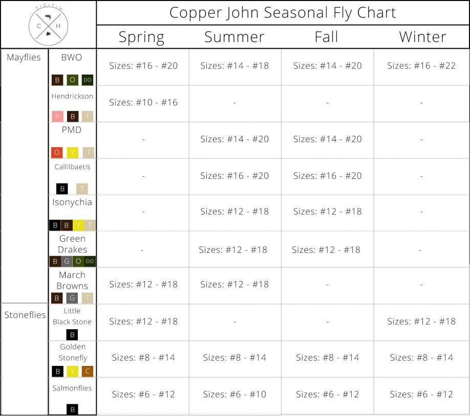 If you are fishing in spring and want to have a copper john imitate BWO, Hendricksons, and March Brown mayfly nymphs, then you’ll want sizes #16-#20 in Brown, Olive or Dark Olive, and you’ll want Sizes #10 – #16 in Brown, Pink or Tan for Hendricksons, and you’ll want #12 – #18 in Brown, Gray or Tan for March Browns. If you want to simplify the selection, you’ll see that Brown is always a color that holds strong across every insect and species, so you can carry Brown in size #10 – #18 to simplify your selection and carry fewer flies, or carry the lot and always be prepared.