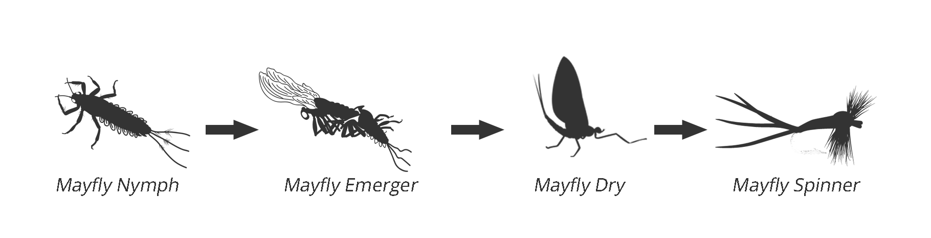 Know these 5 stages and then visit our fly shop section of the site. These 5 stages are outlined on each and every pattern, giving you insight into which patterns imitate which stages.